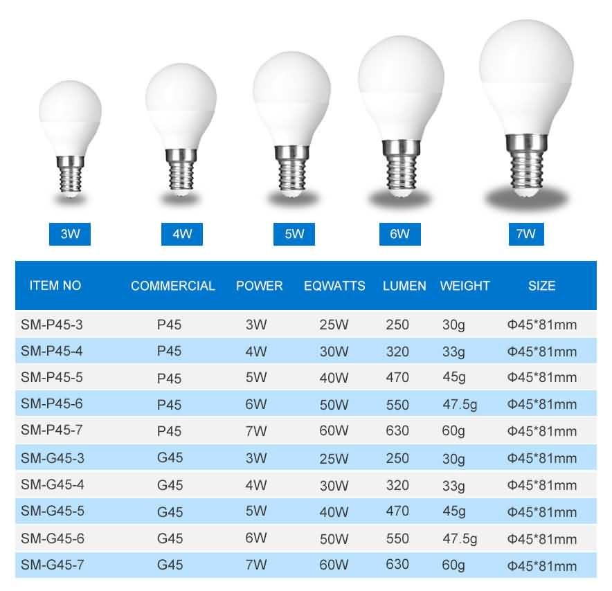 P45 LED light bulbs are used in a variety of applications in which a ball shaped light source is required for decorative and vanity fixtures like for example ceiling fans, bathroom vanities, accent fixtures, restaurant pendant lights, ornamental lights, commercial light strings, decorative light strands, RV interior lighting, and boat cabin lighting. Globe shape bulbs emit light in all directions for full illumination. They can be placed in light fixtures either on the ceiling or on the walls to deliver background illumination. Because LED lights feature instant brightness and high light levels they are ideally fitted to this purpose, including in larger rooms. Globe shape LED lights can also be used in bedside lamps and standard lamps for accent lighting, which produces more appealing effects than ambient lighting. They can also be employed in reading lamps directed in a selected area for focused light. This type of lighting is referred to as task lighting.